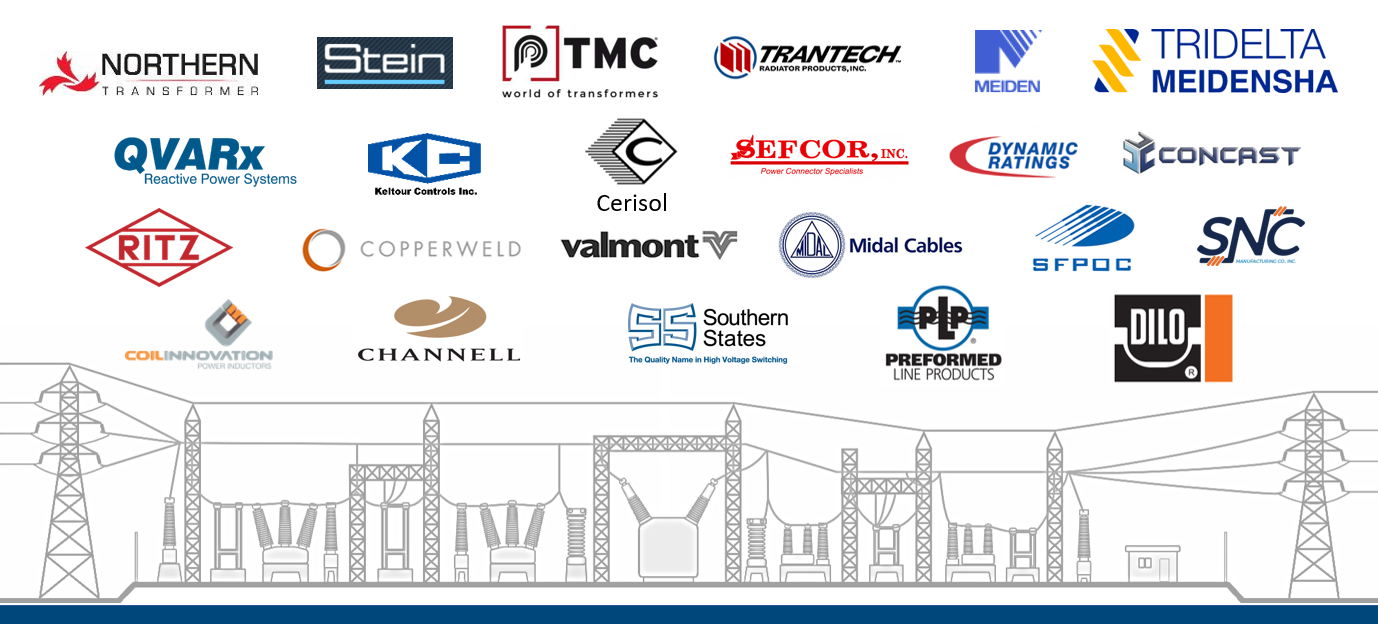 Disjoncteurs sous vide 38kV à 145kV, sectionneurs 5kV à 800kV, parafoudres 5kV à 800kV, transformateurs de puissance à l'huile, transformateurs de malt, transformateurs à sec, radiateurs et vannes à transformateurs, colonnes isolantes 15kV à 800kV, caniveaux préfabriqué à câbles, connecteurs de puissance de poste, circuit switchers, poteaux tubulaires d'acier de distribution et transmission, réactances à air 15 à 800kV, copperclad, conducteurs aériens en aluminium, quincaillerie de lignes, etc.